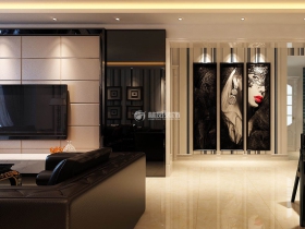 本案装修风格定位为现代风格,地面为理石花纹的抛釉砖,搭配黑色皮质的家具。软装饰搭配丝绒,金色丝线等,饰品摆件以粗纹理的瓷器和多色彩的配饰。电视背景墙用黑镜和亚光米色皮质背景墙,大面积中性色配高纯度色彩是现代风格的特征。